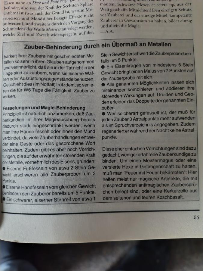 Größere Mengen Eisen am Zauberkundigen wirken sich negativ sowohl auf die Regeneration von AsP als auch auf das Wirken von Zaubern aus. Pro vollen 2 Stein Eisen, die ein Zauberer mit sich trägt, ist das Wirken von Zaubern um je 1 erschwert. Trägt er mehr als eine Stunde solche Mengen Eisen mit sich herum, sinkt die Regeneration von AsP pro Regenerationsphase pro volle 2 Stein Eisen um 1.