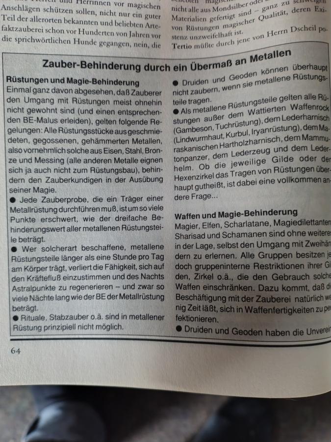 Bei der Interpretation scheiden sich in den Foren die Geister. Einige legen das als getragene Rüstung aus Eisen und Stahl, bei anderen geht es bis zu den Münzen in der Geldkatze, inclusive Schmuck, Ringe, Werkzeug im Rucksack und Waffen. Würde für mich bedeuten, außer meinem Kampfstab gibt es da nicht mehr viel. Wenn ich der Steinbearbeitung fröne mit der Spitzhacke oder dem Hammer oder Meißel ist es zumindest mit der ASP reg eher schlecht.